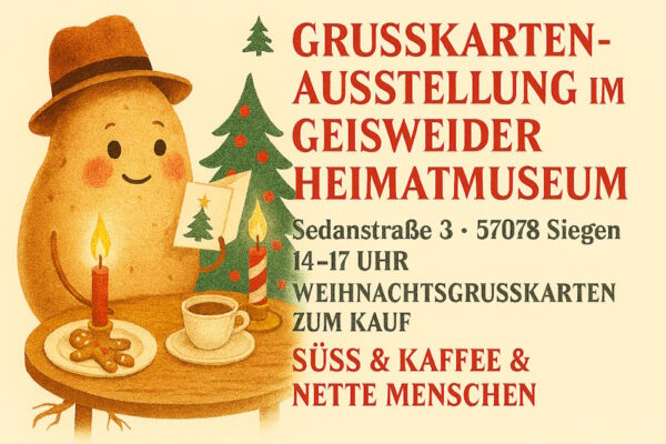 Am 7. November 2025 lädt die Designerwerkstatt „Kunst braucht Zeit“ ins Geisweider Heimatmuseum (Sedanstraße 3, 57078 Siegen) von 14 bis 17 Uhr zu einer liebevoll kuratierten Ausstellung besonderer Grußkarten ein. Im Mittelpunkt stehen stimmungsvolle Weihnachtsgrußkarten – poetisch, verspielt, historisch inspiriert …