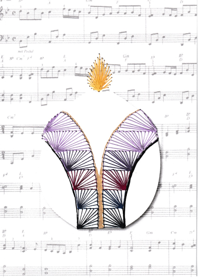 Für diese Grußkarte wählte ich die Form eines Ostereis, um bewusst Abstand von der klassischen Osterkerze zu nehmen und dennoch ihre Bedeutung sichtbar zu machen. Die Stola, die sich von unten nach oben immer weiter aufhellt, steht für den Weg vom Dunkel ins Licht — ein stilles Bild dafür, dass Ostern gefeiert wird, weil der Tod überwunden wurde.